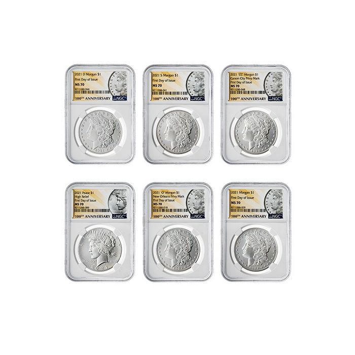 Purchase the 2021 NGC MS-70 First Day of Issue Morgan and Peace Dollar Silver 6-Coin Set - Morgan and Peace Labels online, 24/7, from SD Bullion.