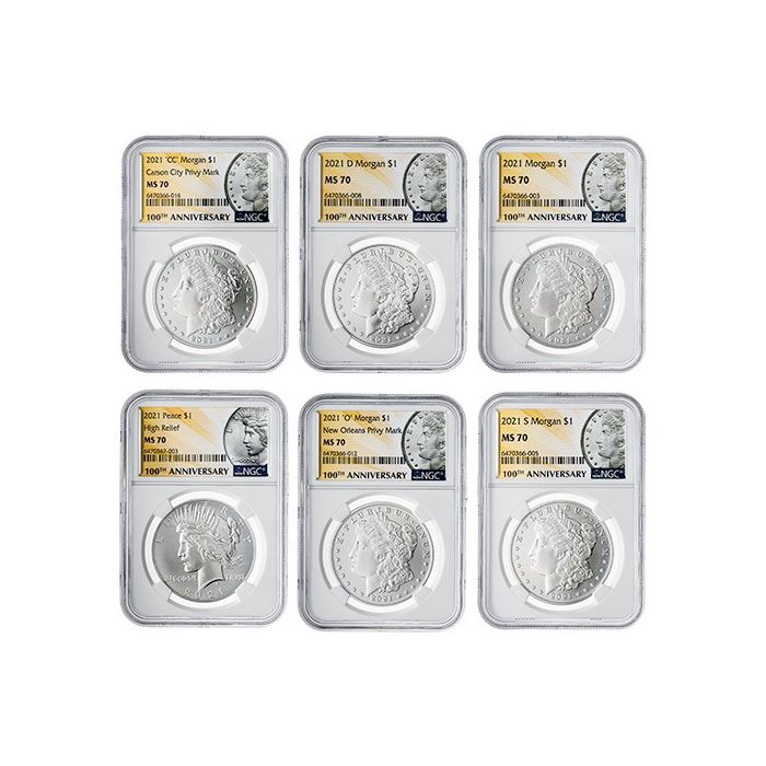 2021 NGC MS-70 Morgan and Peace Dollar Silver 6-Coin Set - Morgan and Peace Labels