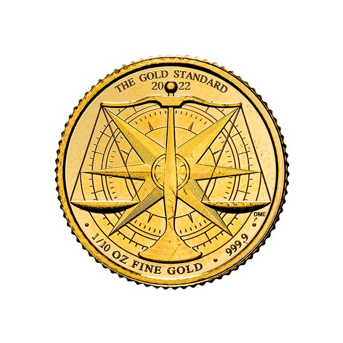 The reverse is a creation of Dominique Evans. It displays icons of the British economic heritage: a weight scale overlapping a navigation compass. The coin’s name and mintage are engraved on top and read: “GOLD STANDARD” and “2022.”