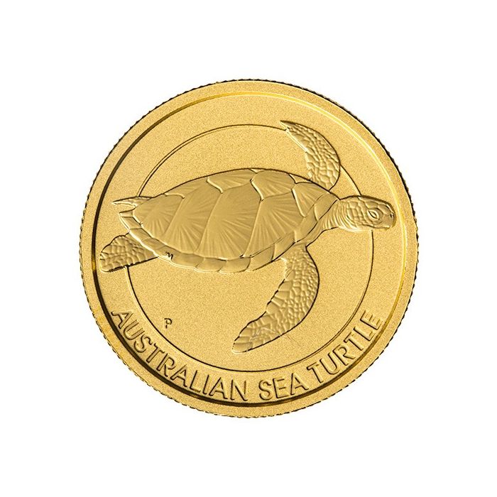 The reverse features an image of an Australian Sea Turtle beneath that inscription and a discreet “P” mint mark, referring to the Perth Mint.