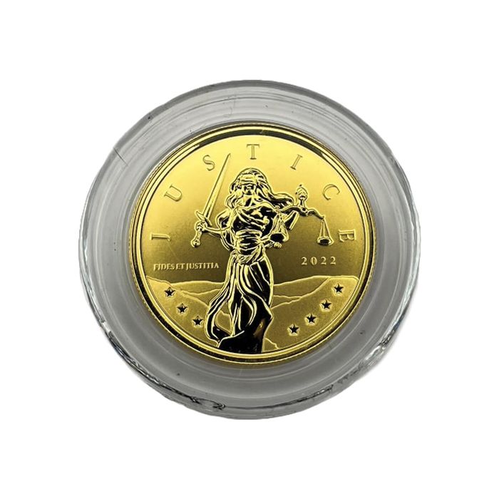 The depiction is flanked by the Latin motto “FIDES ET JUSTITIA” and the year of issuance, “2022.” The word “JUSTICE” arches over her, and seven five-pointed stars complete the image on the bottom rim.
