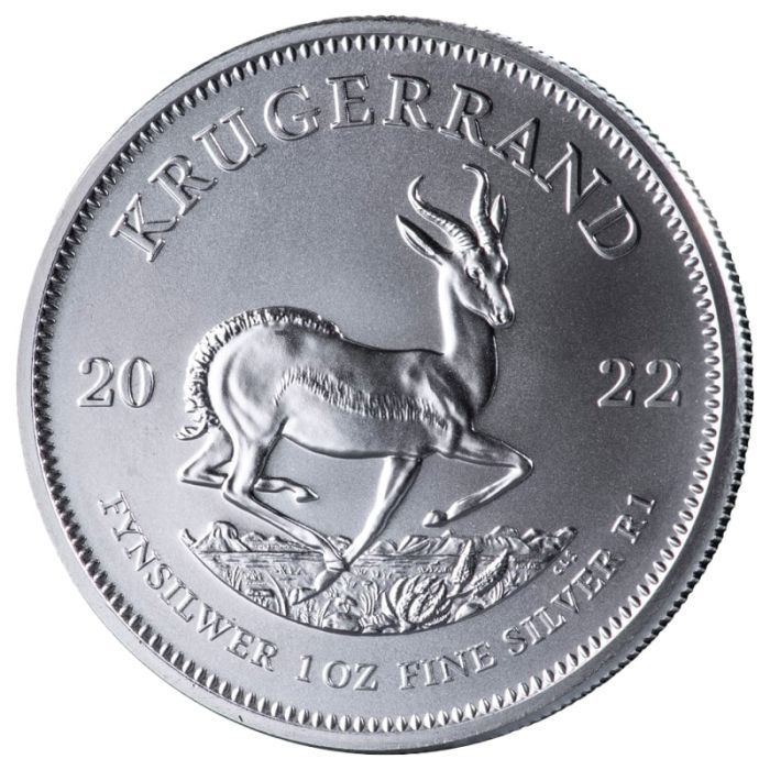 The inscriptions "KRUGERRAND" and "FYNSILWER 1 OZ FINE SILVER R1" encircle an image of a Springbok Antelope running across broad plains with mountains in the distance on the reverse of the coin. The year “2022” is also inscribed.