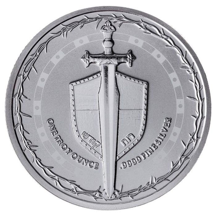 This design features a heraldic showcase of a Sword and Shield prominently featured in the middle. The Sword is simple yet imposing; the Shield sturdy and battle-tested. Surrounding the two is a stylized belt framing the coin with the weight and purity displayed. Around the rim is a striking weave of thorny vines, symbolizing a crown of thorns. At the very tip of the Sword is a snake which is barely visible to the naked eye. The Sword piercing a snake adds a compelling historical element which has ties to countless motifs from cultures throughout human history.
