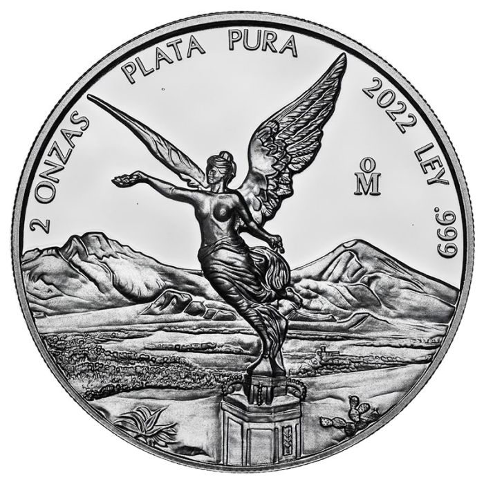 The obverse depicts the Angel of Victory. The nation got a feminine personification with open free wings in a high monument in Mexico City. Along with the image, the inscriptions refer to the coin’s identity. “2 ONZAS PLATA PURA 2022 LEY .999” stands for weight, metal content, year of issuance, and purity. The “M” on the right is the Mexican Mint mark.