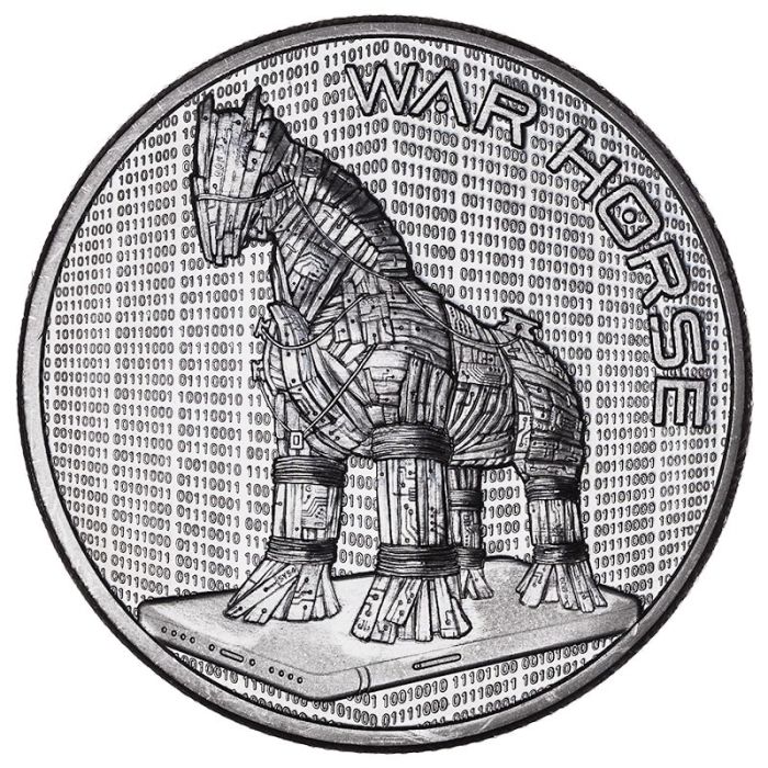 This 2 oz High Relief Silver Round is named "War Horse" and is a modern application of the iconic Trojan Horse from Homer's Iliad. The famous structure was said to have been used by the Greeks in the Trojan War to enter the city of Troy, completely undetected. This design offers a contemporary parallel to this exact phenomenon. Modern technology, primarily cell phones, possess an alarming ability to track and store private personal data and act as a wolf in sheep's clothing, harvesting and selling a myriad of data that directly threatens personal privacy and security.