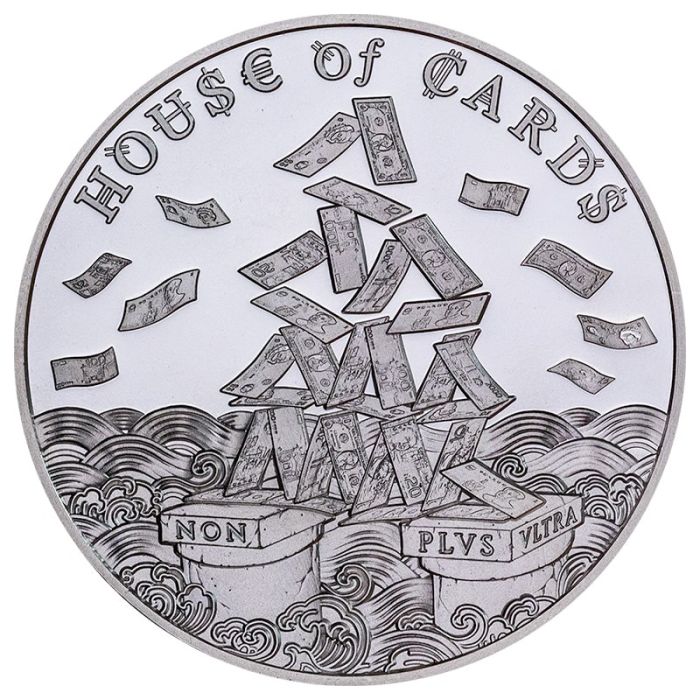 The obverse illustrates a familiar motif: a tall tower somehow constructed out of paper, each row growing gradually smaller and more vulnerable, known colloquially as a "House of Cards". However in this design, the tower is composed of the most common world currencies of our time. The US Dollar, Euro, Yen, British Pound, Rupee, Swiss Franc, and more are all found throughout the levels of the tower of fiat notes. The House of Cards is deteriorating, with swirling winds and rising tides beginning to overcome the feeble structure.
