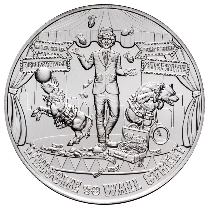 This fascinating High Relief 5 oz Silver Round succeeds the incredibly popular inaugural pieces called "Infinity" and "Ama-Gi Liberty" that collectors instantly connected with. "Welcome To Wall Street" offers similar themes of corruption and deception that create a captivating silver round.