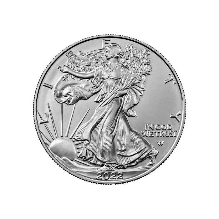 All 2022 Silver American Eagles contain one troy ounce (31.103 grams) of .999 fine silver. These silver coins have a diameter of 40.6 mm (1.598 in) and come in Brilliant Uncirculated (BU) condition. The Silver American Eagle is available solely weighing 1 ounce, while the American Gold Eagle is in weights of 1 ounce, ½ ounce, ¼ ounce, and 1/10 ounce.