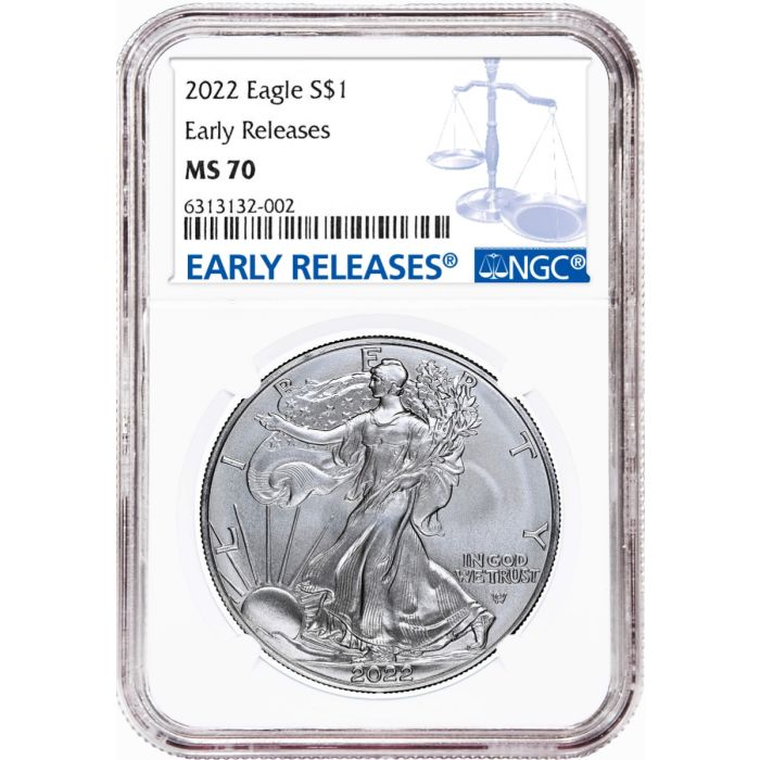 The 2022 NGC MS-70 Early Release American Silver Eagle is noteworthy for many reasons. This coin was given an MS-70 grade, meaning it does not show any imperfections. The coin is also an Early Release edition, meaning that the American Silver Eagle was struck by the U.S. Mint within the first 30 days of release. The coin’s perfection can be preserved in the acrylic slab that each coin comes in. The slab has an NGC label with all of the identifying information. The coin's value is reflected in its limited production and great demand.