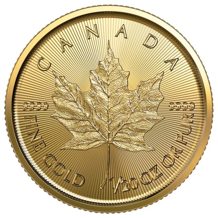 The Maple Leaf is the image engraved on the reverse. The national symbol appears in a central position with the inscriptions: “CANADA,” “9999,” “FINE GOLD,” 1/20 OZ,” “OR PUR,” and “9999,” referring to the coin’s origin, metal content, purity, and weight, in English and French.