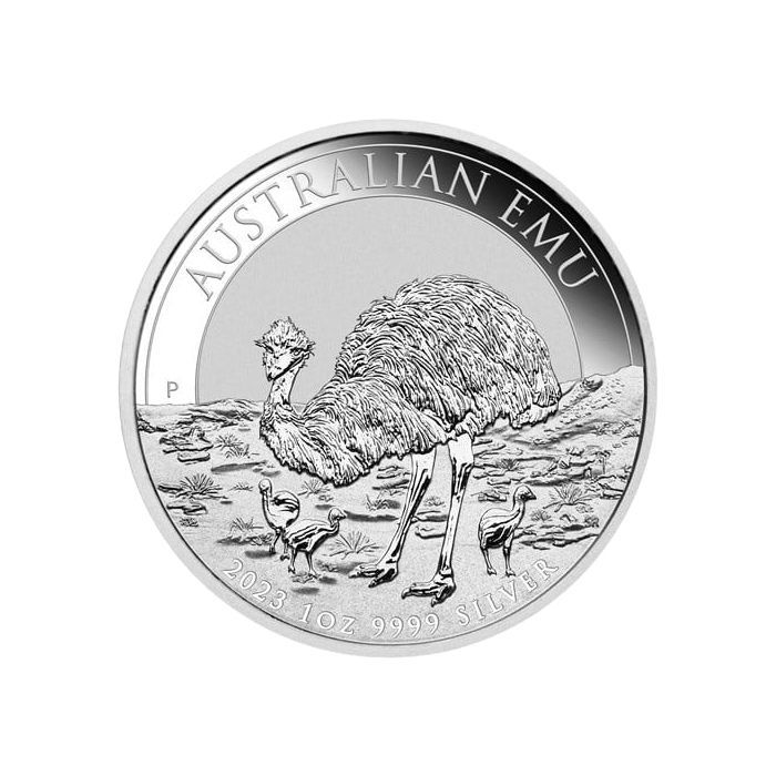 The reverse showcases an adult Australian emu and her offspring in an outback landscape. The inscription "Australian Emu" arches over the image and is accompanied by the Perth Mint's "P" mint mark, the year-date, weight, and purity, which read: “2023 1 oz 9999 SILVER.”