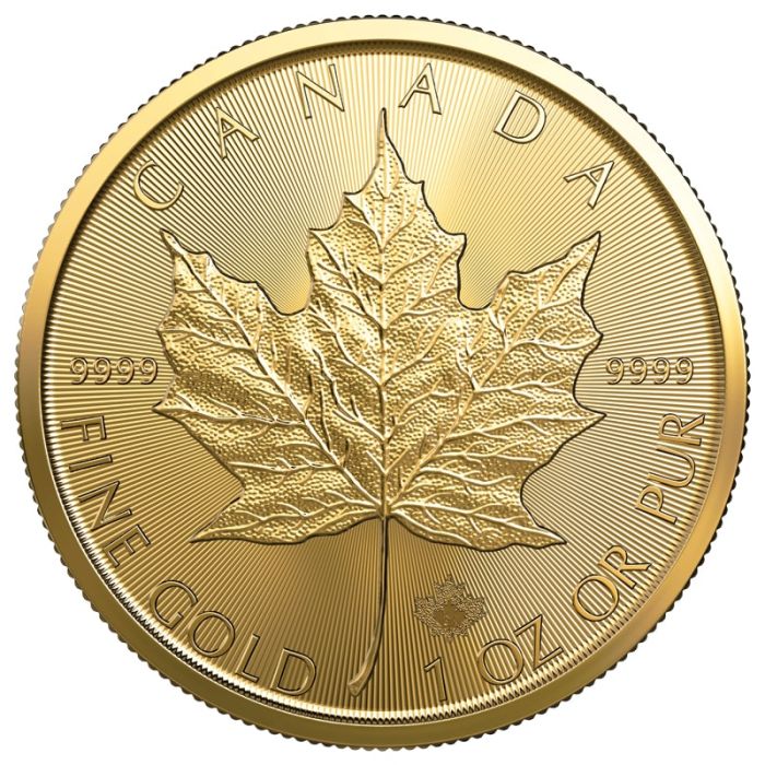 The reverse depicts a Canadian national symbol: the sugar maple leaf. The English and French inscriptions on the outer rim refer to the coin’s origin, metal content, purity, and weight: “CANADA,” “9999,” “FINE GOLD,” “1 OZ,” and “OR PUR.”