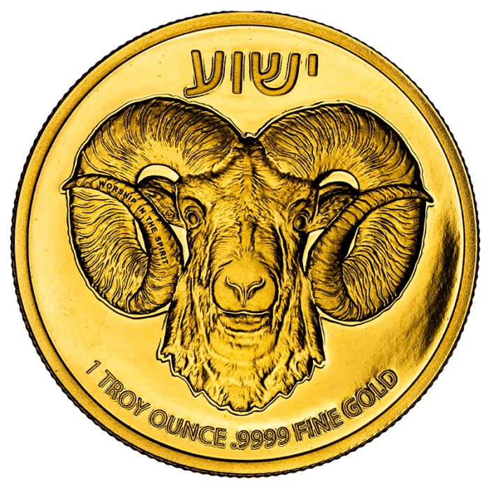The reverse design stamps a frontal close-up of the Ram with sweet staring eyes and massive horns. The Ram is usually a symbol of the Lamb or Son of God. The hidden message is micro-engraved in its horn and reads: “worship in the spirit,” from John 4:24. The Hebrew lettering “ישוע” above the animal’s depiction means Yeshua (Jesus). And the inscriptions on the bottom rim correspond to the coin's weight of “ONE TROY OUNCE,” “.9999” purity levels, and metal content “FINE GOLD.”