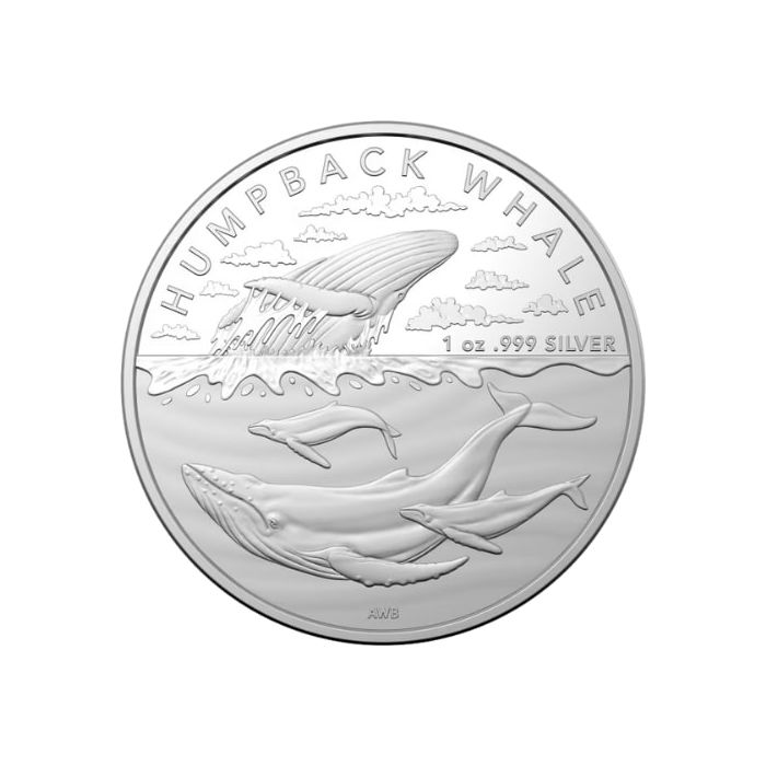 The coin’s name, “HUMPBACK WHALE,” arches over the image, and the coin’s weight, purity, and metal content are aside, reading “1 oz .999 SILVER.”