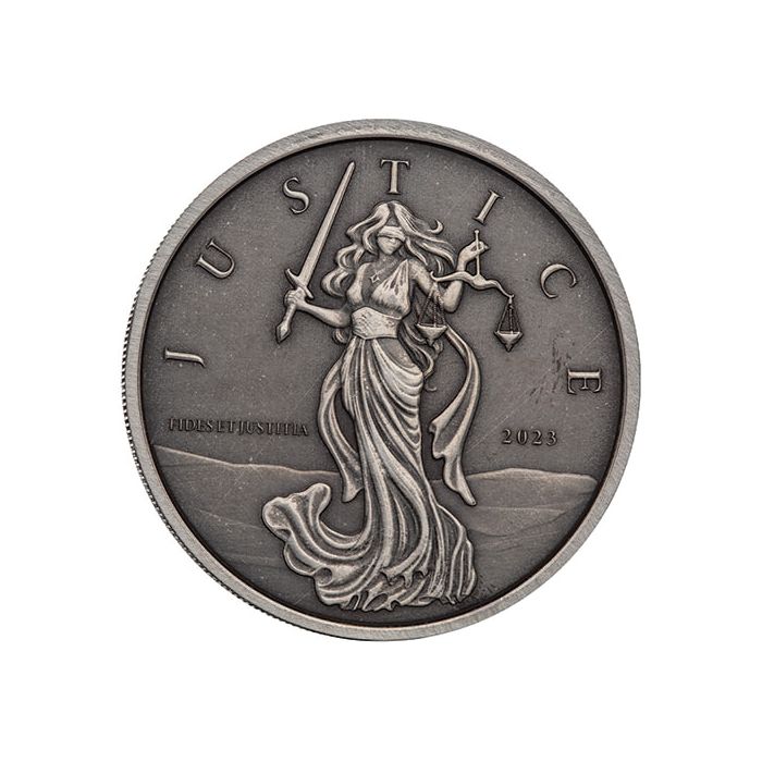 The inscriptions on this side are “JUSTICE,” “FIDES ET JUSTITIA,” and “2023.”