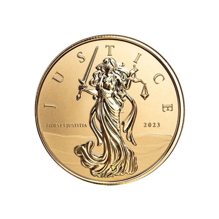 The Lady has “JUSTICE” arching over her, the Latin motto “FIDES ET JUSTITIA” and the year of issuance, “2023”, flanking her.
