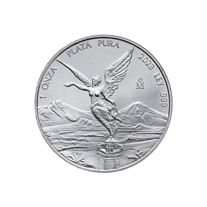 The reverse design features the Angel of Victory, the Monument of Freedom located in Mexico City. The angel is a feminine figure of the nation with arms and wings open, with two folk mountains, Popocatepetl and Iztaccihuatl, in the background. The inscriptions that complete the image refer to the coin’s weight, metal content, fineness, and year of issuance. They read “1 ONZA PLATA PURA 2023 LEY .999.” And the “M” on the right identifies the Mexican Mint.