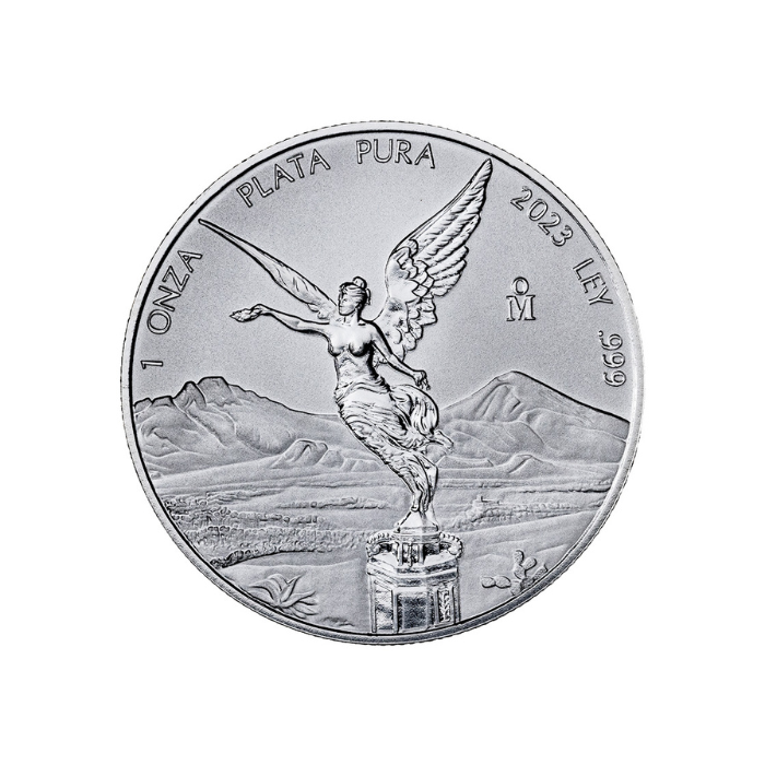 The inscriptions on this side are “1 ONZA PLATA PURA 2023 LEY .999,” describing the coin’s weight, metal content, fineness, and year of issuance. The “M” on the right identifies the Mexican Mint.