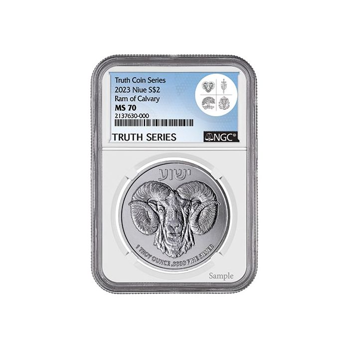 The 2023 Silver Ram of Calvary NGC MS-70 1 oz Coin has been given a perfect MS-70 grade, meaning the coin has zero imperfections. Graded by NGC, one of the most well-known grading agencies in the world, this prestigious MS-70 rating is the highest grade that can be given to a coin. Slabbed in SD Bullion's exclusive, custom Truth Series label, NGC's certification provides customers with an additional layer of assurance that their coin is authentic and legitimate.