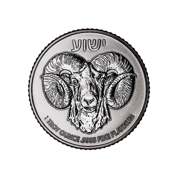 The reverse design names the coin. It showcases the Ram in a frontal close-up with staring eyes and massive horns. The Ram represents the Lamb of God, and the hidden message, usual to all Truth Coins, is micro-engraved in its horn as “worship in the spirit,” from John 4:24. Combine with the other releases from the 2023 Truth Series to reveal a Scripture passage. The lettering “ישוע” over the animal’s head means Yeshua (Jesus) in Hebrew. The inscriptions beneath it are “ONE TROY OUNCE .9995 FINE PLATINUM,” referring to the coin’s weight, fineness, and metal content.