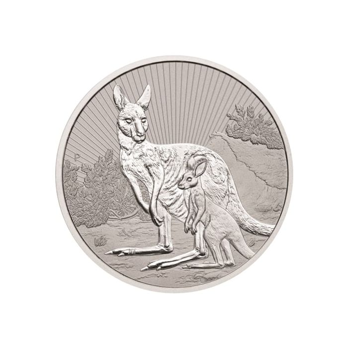 The reverse design names the coin and justifies the series moniker, as it showcases an Australian Kangaroo, a National symbol, and its next generation, represented by its joey, in their natural habitat.