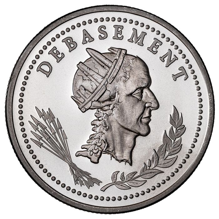 Along the top rim of the coin is the word “Debasement”, which refers to the economic practice of decreasing something’s intrinsic value while maintaining its face value. This famously led to the value of the Roman denarius decreasing significantly as its silver content per coin gradually decreased over time. This ultimately resulted in hyper-inflation and led to financial ruin across the Roman Empire over the course of hundreds of years.