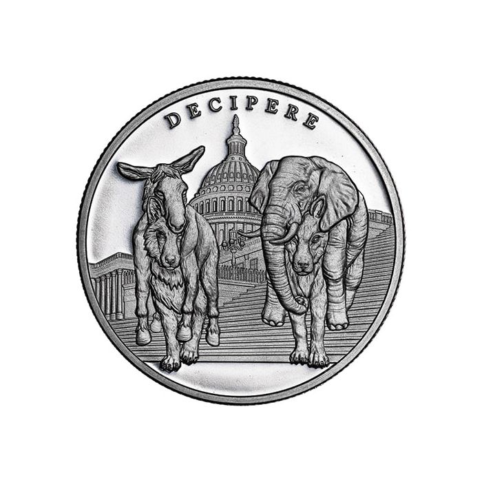 The coin’s obverse boldly displays two large wolves staring commandingly at the viewer while shrouded in the carcasses of the political party mascot animals; the donkey and the elephant. This is a play on the popular motif of the “wolf in sheep’s clothing,” and represents the dangerous animosity and wolf-like nature under the surface of the political parties. They stand proudly on the steps of the United States Capitol building. Along the top rim of the coin is the word “Decipere”, which is latin for “to cheat/deceive”.