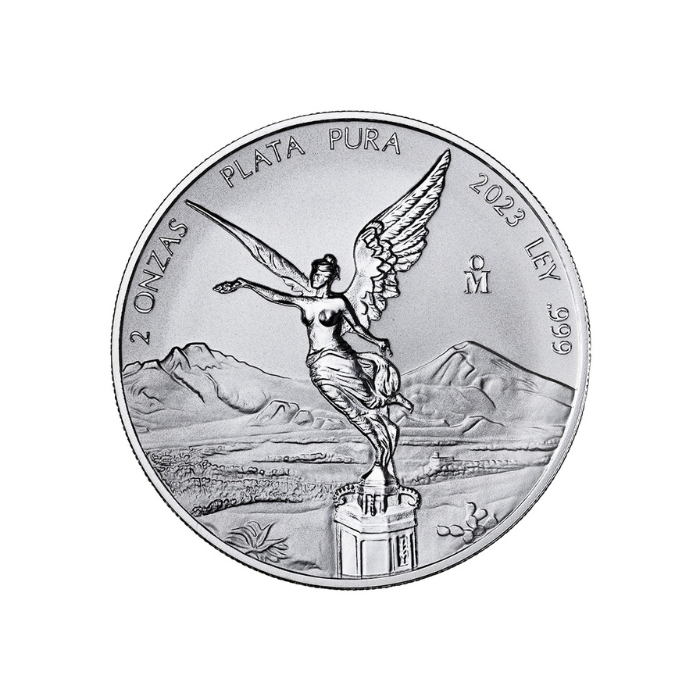 “2 ONZAS PLATA PURA 2023 LEY .999” describes the coin’s weight, metal content, year of issuance, and purity. The “M” on the right is the Mexican Mint mintmark.