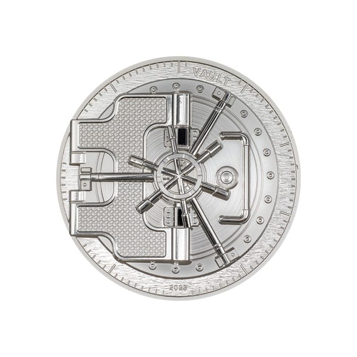 The reverse design is a detailed antique bank vault with a secure armored door and complex locks. The only engravings on this side correspond to the coin’s name arched on top, “VAULT,” and the year of issuance on the bottom. Unlike most coins, these have plain edges.