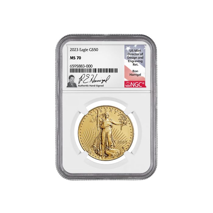 Purchase the 2023 NGC MS-70 1 oz American Gold Eagle Coin - Ron Harrigal Label online, 24/7, from SD Bullion.