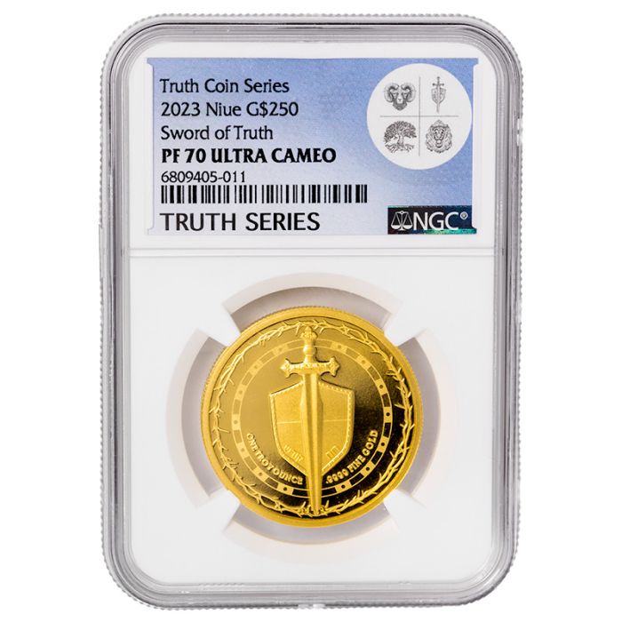 The 2023 Gold Sword of Truth NGC PF-70 1 oz Coin has been given a perfect PF-70 grade, meaning the coin has zero imperfections. Graded by NGC, one of the most well-known grading agencies in the world, this prestigious PF-70 rating is the highest grade that can be given to a coin. Slabbed in SD Bullion's exclusive, custom Truth Series label, NGC's certification provides customers with an additional layer of assurance that their coin is authentic and legitimate.
