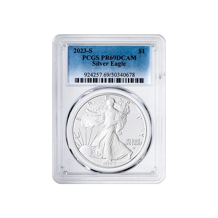 Today, SD Bullion offers 2023-S 1 oz American Eagle Silver Proof Coins, sealed in PCGS slabs and certified as PR-69 samples.