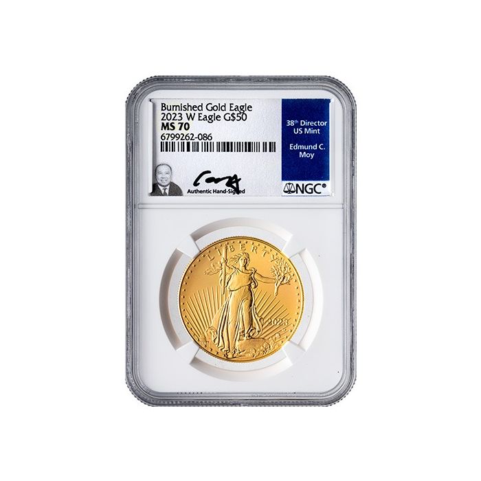 Today, SD Bullion offers 2023-W 1 oz Burnished American Gold Eagles, certified by NGC as an MS-70 coin, and sealed with NGC Edmond C Moy Label.