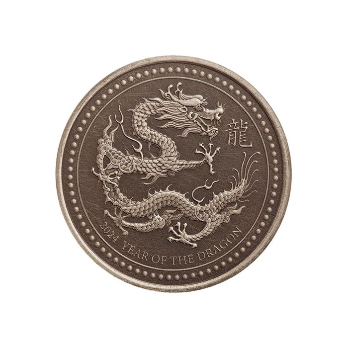 The reverse design features the Dragon with sharp paws and a twisted tail, the corresponding Chinese symbol, and “2024 YEAR OF THE DRAGON” on the bottom.