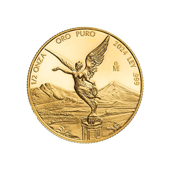 The “M” mint mark from the Mexican Mint lies aside, but the reverse also contains the inscriptions “1/2 ONZA ORO PURO, “2024,” and “LEY .999,” describing the coin’s essential information.