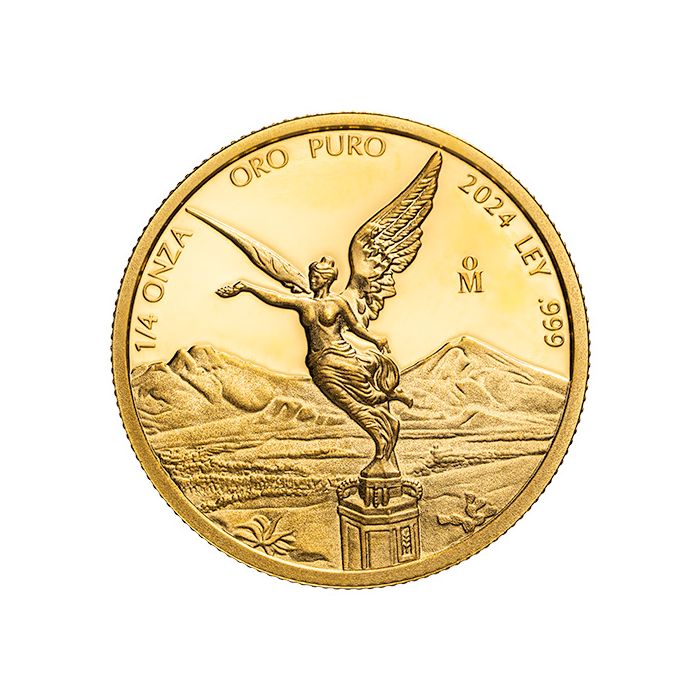 The reverse side shows the Winged Victory, the nation's feminine personification, which is also a monument in Mexico City. This side also includes the inscriptions “1/4 ONZA ORO PURO,” “2024,” and “LEY .999,” indicating the coin’s weight, metal content, year of issuance, and purity.