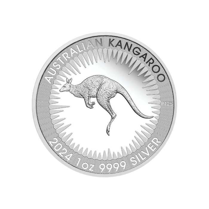 The inscription “AUSTRALIAN KANGAROO,” referring to the series moniker, arches over the image while the coin’s year of issuance, weight, metal content, fineness, and year of issuance are at the bottom rim. They read: “2024 1 OZ 9999 SILVER.”