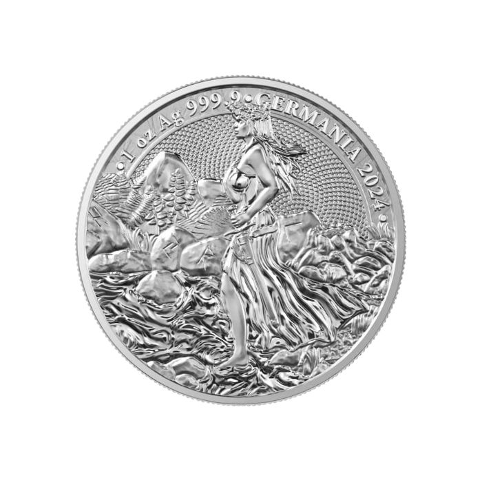 The information inscribed on top refers to weight, metal content, purity, the series name, and the year of issuance. The inscriptions read: “1 oz Ag 999.9” and “GERMANIA 2024.”