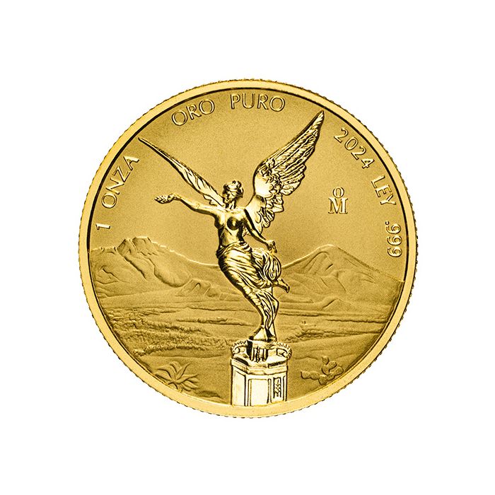 The inscriptions on this side provide details about the coin’s weight, metal content, year of issuance, and purity: “1 ONZA ORO PURO,” “2024,” and “LEY .999.” The "M" mint mark aside indicates the Mexican Mint issuance.