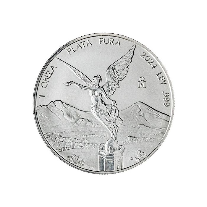 The inscriptions reading “1 ONZA PLATA PURA 2024 LEY .999” describe the coin’s weight, metal content, fineness, and year of issuance. The “M” on the right identifies the Mexican Mint.
