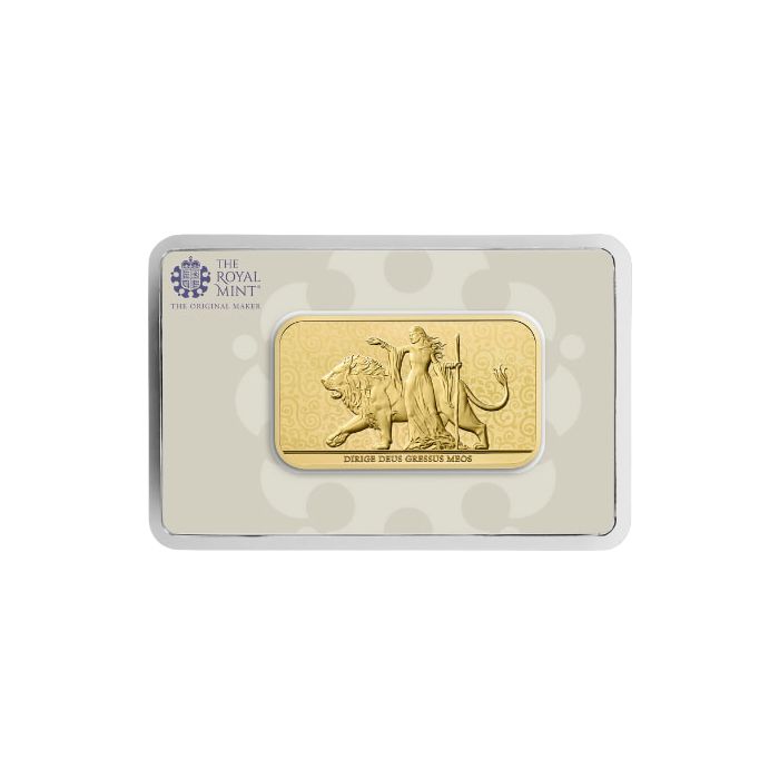 The reverse side has the same background pattern and is imprinted with the Royal Mint logo and the bar’s essential hallmarks regarding weight, metal content, and purity, which read “1 oz 999.9 FINE GOLD.”