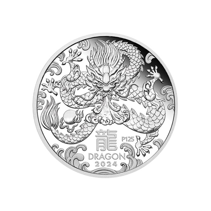 The essential engravings are beneath the Dragon and correspond to its Chinese character, “DRAGON 2024,” and a “P125,” which stands for the 125th anniversary of the Perth Mint.