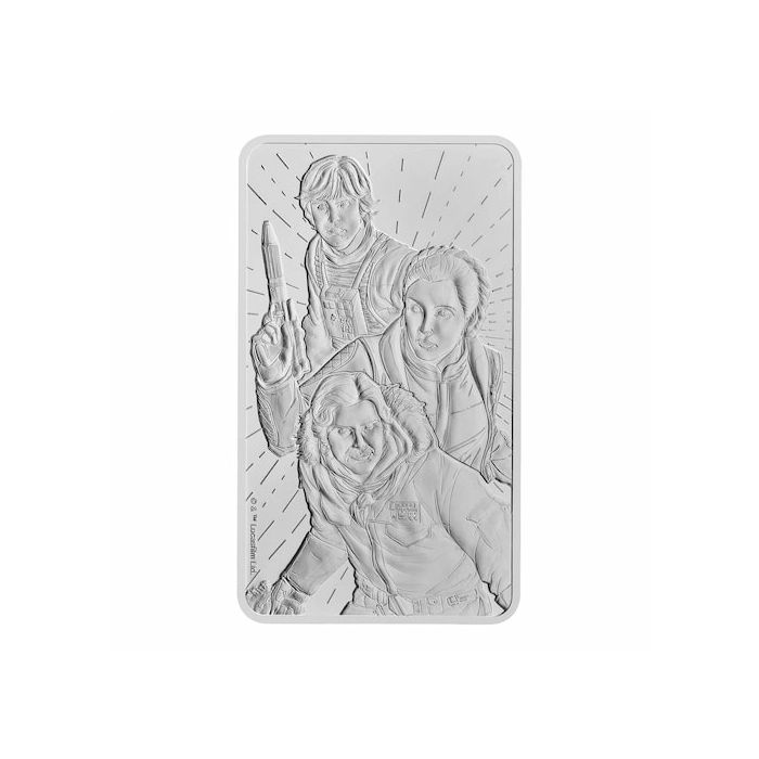In addition to the standard one-ounce bar, the collection features a 10 Troy oz bar made of 99.99% pure silver adorned with the legendary heroes from the original trilogy rendered in comic book-style illustrations.