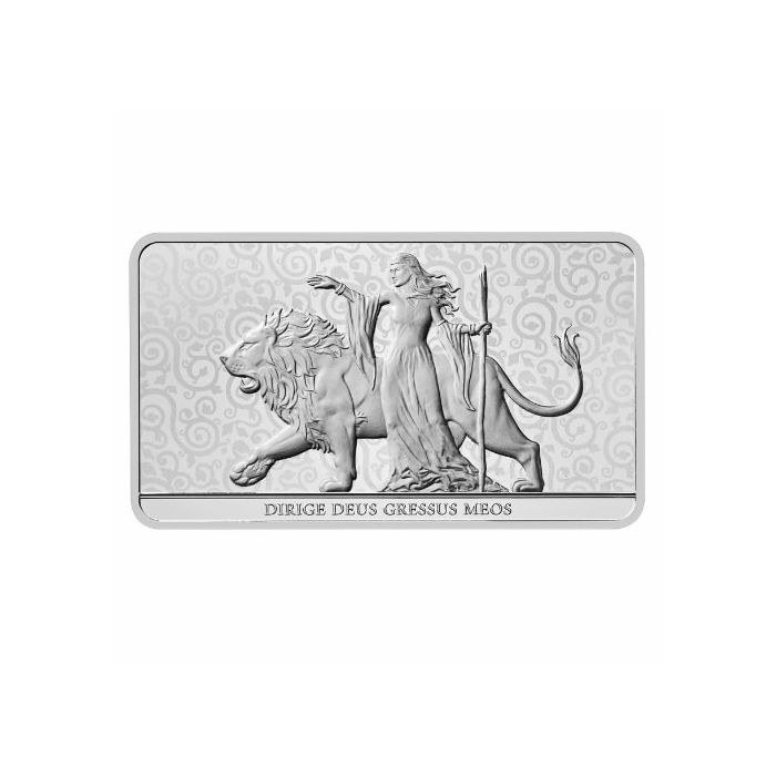 Clark’s design is a landscape-orientated image, an innovation in the Royal Mint’s bars. It displays Una and her loyal lion, overlapping a decorated pattern used as a backdrop, and the words “DIRIGE DEUS GRESSUS MEOS,” which translates to “May God direct my steps,” engraved at the bottom. This text was featured on the original design of the Una and the Lion coinage minted by the Royal Mint.