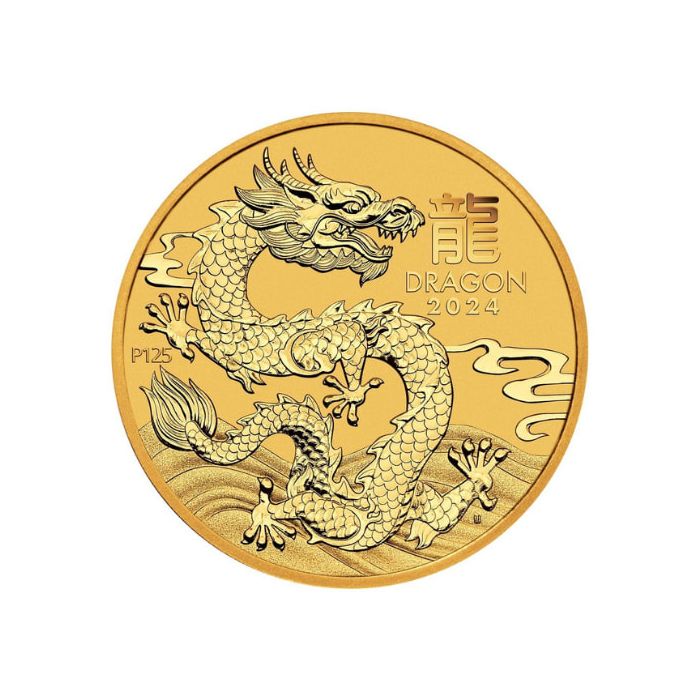 The corresponding Chinese character for the animal is on the right, with “DRAGON 2024,” and on the left, “P125,” represents the Perth Mint’s 125th anniversary.