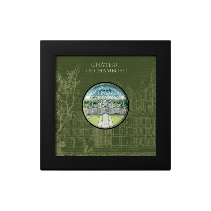 The coin beautifully captures the majestic silhouette of the Château de Chambord, nestled amidst the picturesque landscapes of the Loire Valley in France.