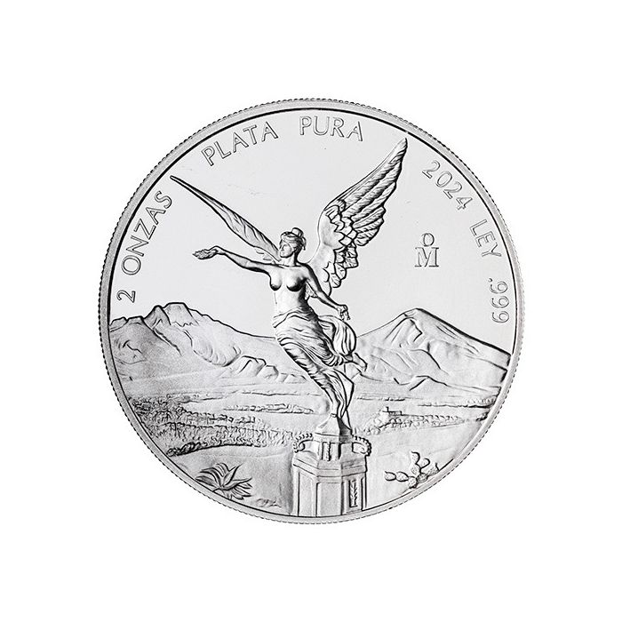 The reverse depicts the Angle of Victory along with the inscription "2 ONZAS PLATA PURA 2024 LEY .999," indicating its weight, metal content, year of issue, and purity. The “M” mintmark on the right represents the Mexican Mint.