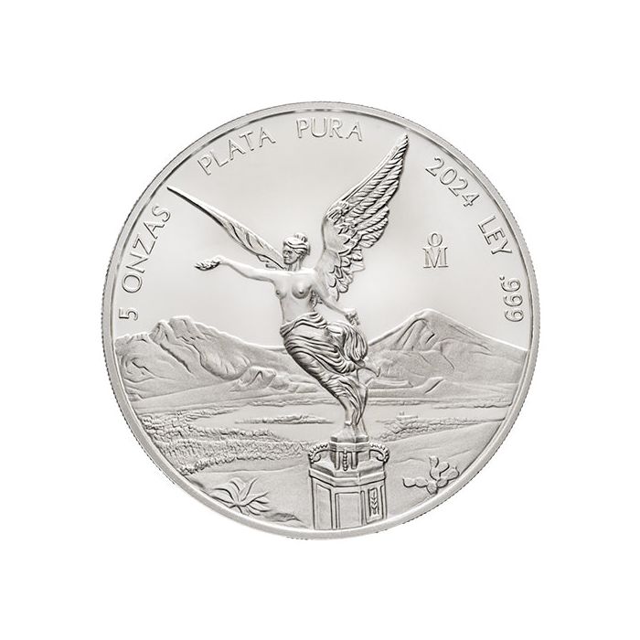 The reverse design showcases the feminine representation of the free nation through the Winged Victory. Along with the image, read: “5 ONZAS,” “PLATA PURA,” “2024,” and “LEY .999,” referring to the coin’s weight, metal content, purity, and issuance. The Mexico Mint mintmark appears aside through the “M” on the right.