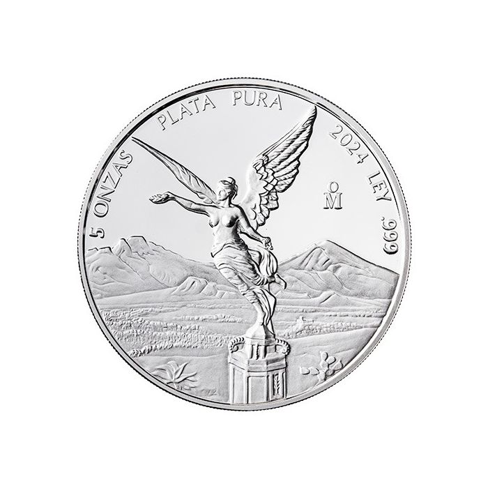 The accompanying engravings “5 ONZAS,” “PLATA PURA,” “2024,” and “LEY .999” inform the coin’s weight, metal content, purity, and issuance.