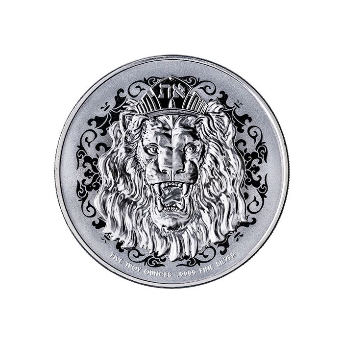 The inscriptions “FIVE TROY OUNCE .9999 FINE SILVER” engraved beneath the crowned lion refer to the coin’s weight, metal content, and purity.